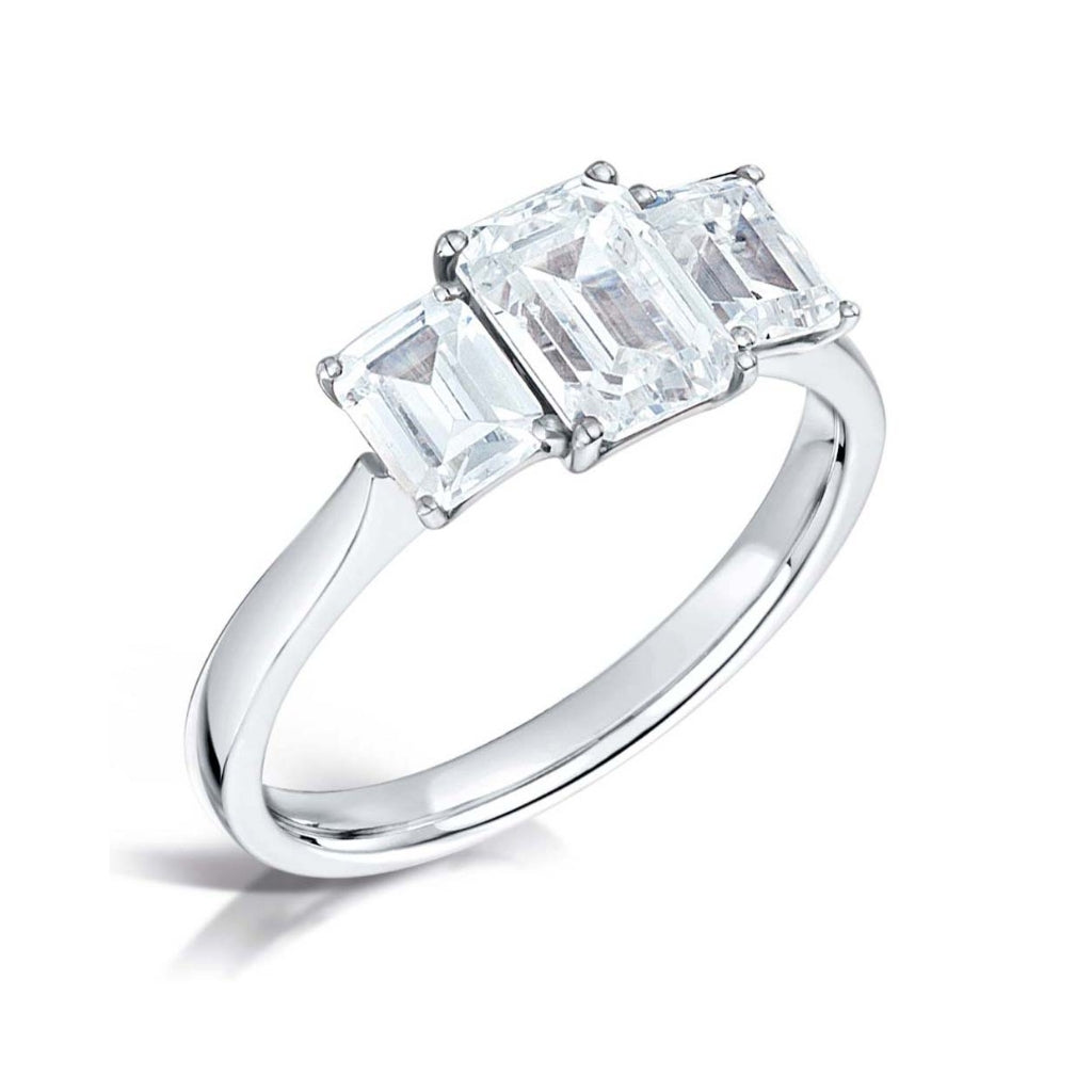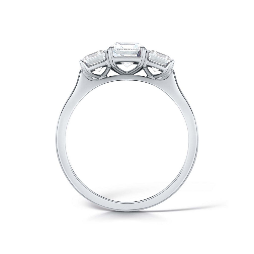 • Clean + simple 4 claw settings focus your attention on the rectangular emerald cut diamonds